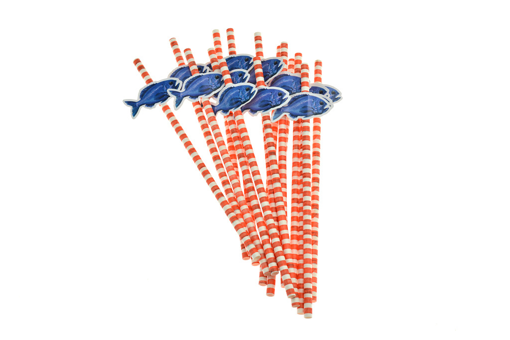 Papírové brčka pruhovaná červeno-bílá s rybou, balení 16ks - Pruhovaná brčka / slámky s rybou z papíru jsou vhodná do studených nápojů, lze použít také do teplých nápojů, maximální teplota nápoje může být 40°C. Délka brčka je 20cm, obsah balení 16ks. prečítať celé