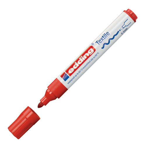 Popisovač na textílie s okrúhlym hrotom strednej hrúbky. Plnený atramentom bez zápachu na báze vody. Farby treba zafixovať žehlením na sucho. Po zafixovaní sú farby odolné voči praniu do 60°C. Šírka stopy: 2-3 mm. Farba: karmínovo červená. prečítať celé