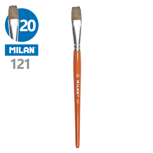 Plochý štetec č. 20 z prírodného pony vlasu, s hnedou lakovanou rukoväťou z dreva so strieborným bezošvým kovaním. Zloženie: 70% prírodné kozie vlasy + 30% syntetické. Vhodný pre akvarel, vodné techniky a temperové farby. Priemer štetín: 14,8 mm. Dĺžka štetín: 18,2 mm. Dĺžka štetca: 201 mm.
