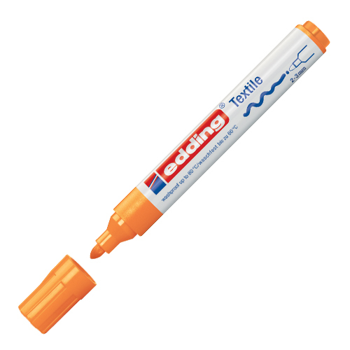 Popisovač na textílie s okrúhlym hrotom strednej hrúbky. Plnený atramentom bez zápachu na báze vody. Farby treba zafixovať žehlením na sucho. Po zafixovaní sú farby odolné voči praniu do 60°C. Šírka stopy: 2-3 mm. Farba: neónovo oranžová. prečítať celé