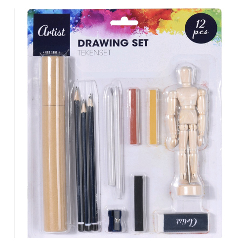 Set na kreslenie pre umelcov na výtvarnú výchovu. Sada 12 ks. Sada obsahuje: ceruzku tvrdosť HB, 5B a 6B, strúhadlo, gumu, 2xpapierové roztieratko, 3xpastel, papierový tubus a drevenú figúrku (veľkosť 155 mm). prečítať celé
