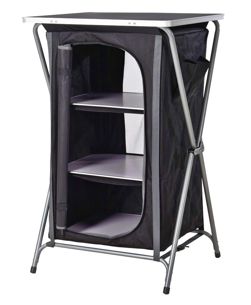 přenosná kempingová skříňka s policemilze kompletně složit na plocho do transportního obaluperfektní na cestování, jako kempingový nábytek i na chatuhliníková konstrukce s pracovní deskou z MDF materiáluplášť z polyesteru 600D v černé barvěvelmi dobře odolný proti protržení a prodřenícelá skříňka...