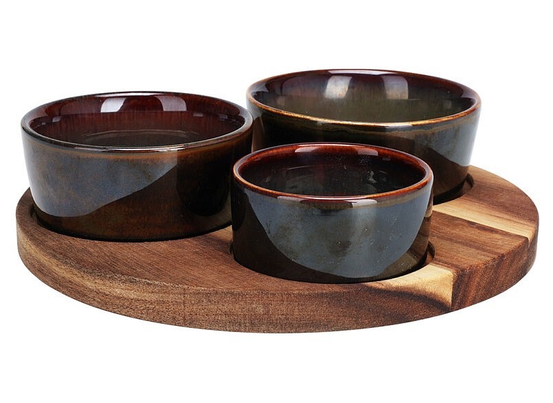 Sada 3 kameninových mističek s velmi zajímavou glazurou na akáciovém tácku ozvláštní servírování a podávání pohoštění. Skvěle se hodí na brambůrky, olivy, křupky, preclíčky, sýry, uzeninu, krekry... Nebo na servírování zeleniny a dipů. Mix 2 barev glazury. Materiál: keramika, akáciové dřevo....