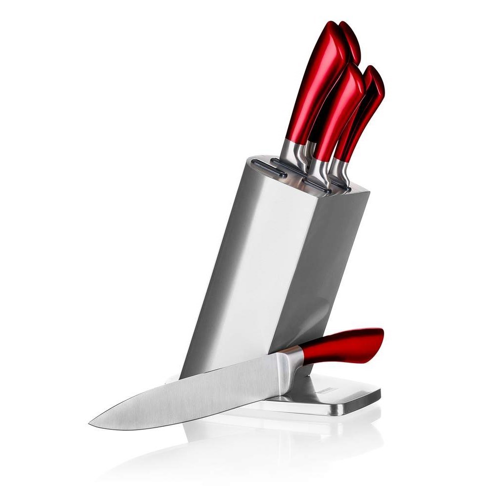 5dílná sada nožů INTENSE II. s nerezovým stojanem. Sada obsahuje nůž kuchařský 33,5 cm, nůž santoku 30,5 cm, nůž na chléb 33,5 cm, nůž univerzální 23,5 cm, nůž praktický 21 cm a nerezový stojan. Nože jsou vhodné pro každodenní použití. Ocelové nože patří mezi nepostradatelné pomocníky v každé...