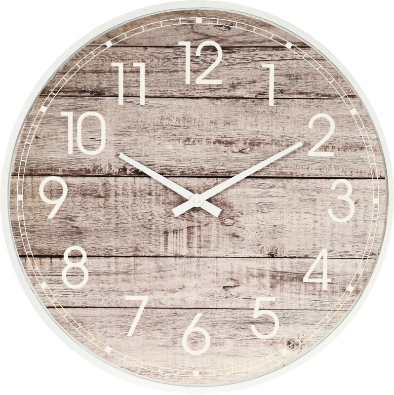 WALL CLOCK, MDF WITH PAPER PRINTING, PRINT LOOKS LIKE WOOD PANELLING. DIA 595MM. WHITE RIM, WHITE NUMBERS AND WHITE HANDS. SIZE: 595X595X45MM. EACH IN WHITE WINDOWBOX SHRINKWRAPPED. B/O, 1X AA BATTERY NOT INCLUDED/ 610X55X610MM, Open Box/Shrinkwrapped (OBSW): WEEE / CFT 3,50,(2.720/40ft HQ)