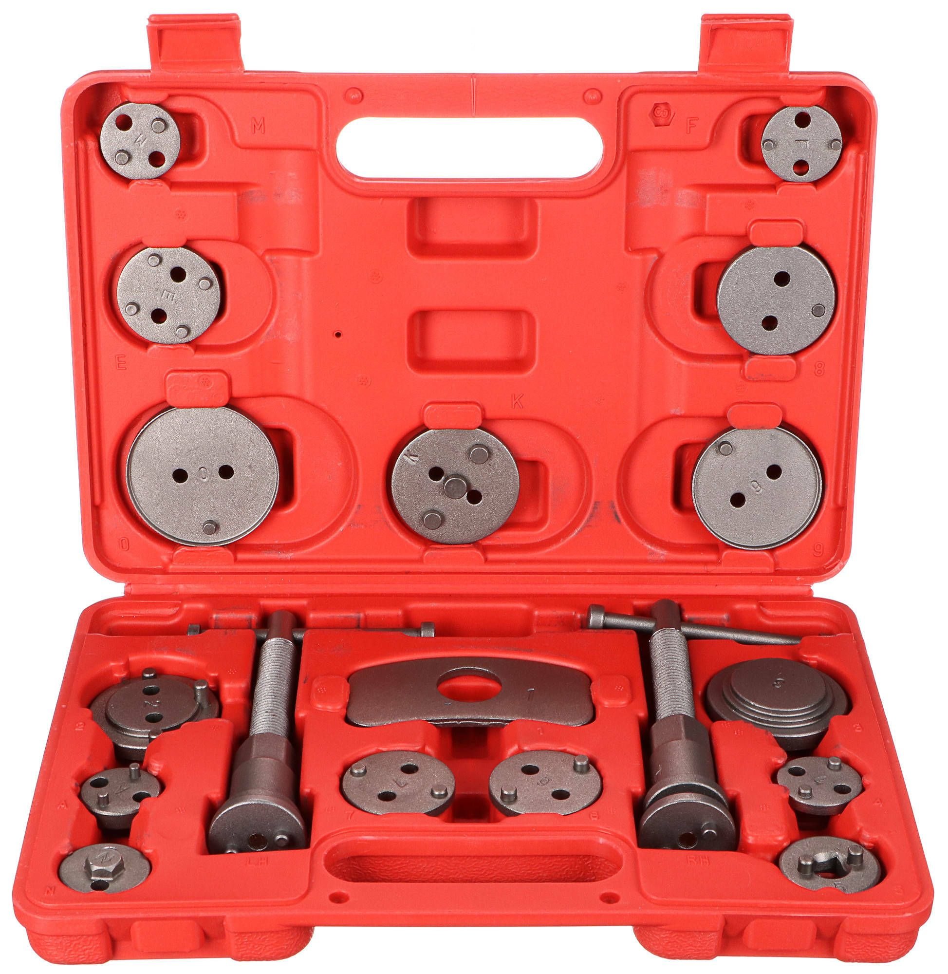 Univerzální sada stlačováků brzdových pístů BRAKE SET s 18 díly v plastovém kufru vhodná k montáži/zpětnému vracení pístů/třmenů kotoučových brzd. Sada obsahuje pravotočivou i levotočivou stlačovací závitnici s magnetem, doraz a 15 různých adaptérů. U vozidel s třmeny kotoučových brzd a s integrovanou jednotkou ruční brzdy se zpětné vracení brzdových pístů provádí zpětným otáčením, u ostatních vozidel zpětným stlačením těchto pístů.