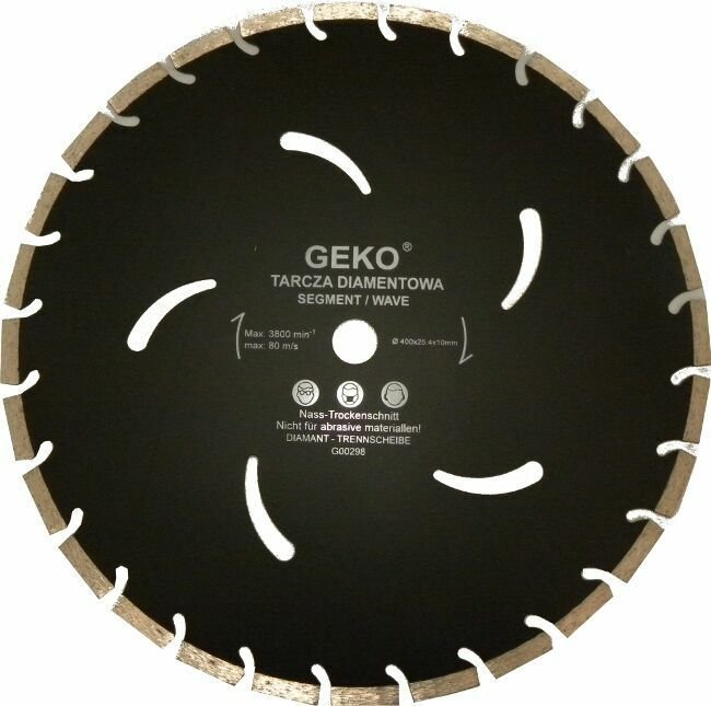 Kotouč diamantový řezný segmentový, 400x10x32mm GEKOPrecizní diamantový řezný kotouč GEKO s přerušovaným diamantovým segmentem po celém obvodu (s drážkami, výřezy), který je rozdělený na určitý počet užších segmentů. Tyto výřezy kotouč během řezání chladí a vynáší obroušený materiál z řezu ven....