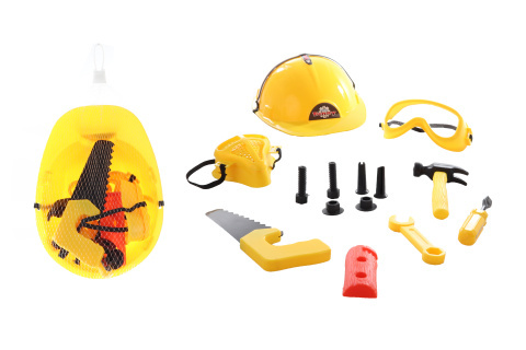 Sada obsahuje všetko, čo malý staviteľ potrebuje: prilbu, okuliare, masku, pílu, kladivko, skrutkovač, kľúč, skrutky a napodobeninu dreva. Všetko je starostlivo zabalené v sieťke pre jednoduché prenášanie a uskladnenie. Táto sada je vhodná pre deti od 3 rokov, čo z nej robí ideálnu hračku pre prvé experimentovanie s prácou s náradím.