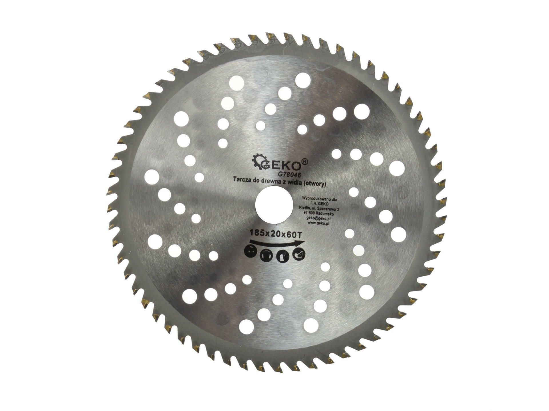 Kotouč pilový vidiový s otvory, 185x20x60T, GEKPilový kotouč je určen pro zpracování měkkého a tvrdého dřeva, dřeva z příčných vláken, dřevotřískových desek a tesařských výrobků. Pečlivě pájené karbidové indukční zuby s pravým úhlem sklonu zajišťují, že ostří zaručuje rychlé a přesné řezání....