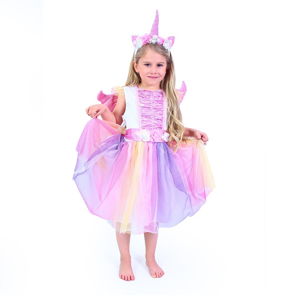 Oslnivý karnevalový dívčí kostým! Kostýmek v růžovo-fialové barvě a velikosti S je určen pro holčičky ve věkovém rozmezí 4-6 let (110-116 cm). Balení obsahuje překrásné šaty v pase zdobeny kvítky, křídla a čelenku s rohem jednorožce posetou květy. Staň se hvězdou karnevalového večírku díky tomuto kostýmu!