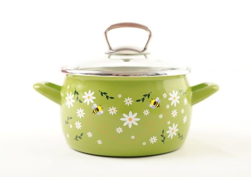 Smaltový hrnec s dekorem drobných kvítků a včeliček. Uvnitř nádoby je nazelenalý smalt, který ladí s vnějším smaltem. Hrnec je opatřen poklicí s nerezovým úchytem. Může být tedy použit i v troubě. prečítať celé