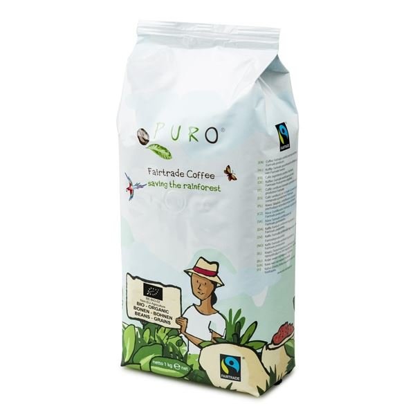 Zrnková káva Fairtrade Puro Bio: 100% Arabica Země původu: Honduras, Peru Profil chutě: plnost 4/5, pražení 5/5, aroma 4/5, kyselost 3/5 Výjimečně lahodná kávová směs se vyznačuje výrazným aroma Spojení nádherně jemné chuti čokolády s citrusovými tóny ji propůjčuje ovocnou svěžest a obohacuje ji o přírodní sladkou chuť *Hmotnost: 1 kg