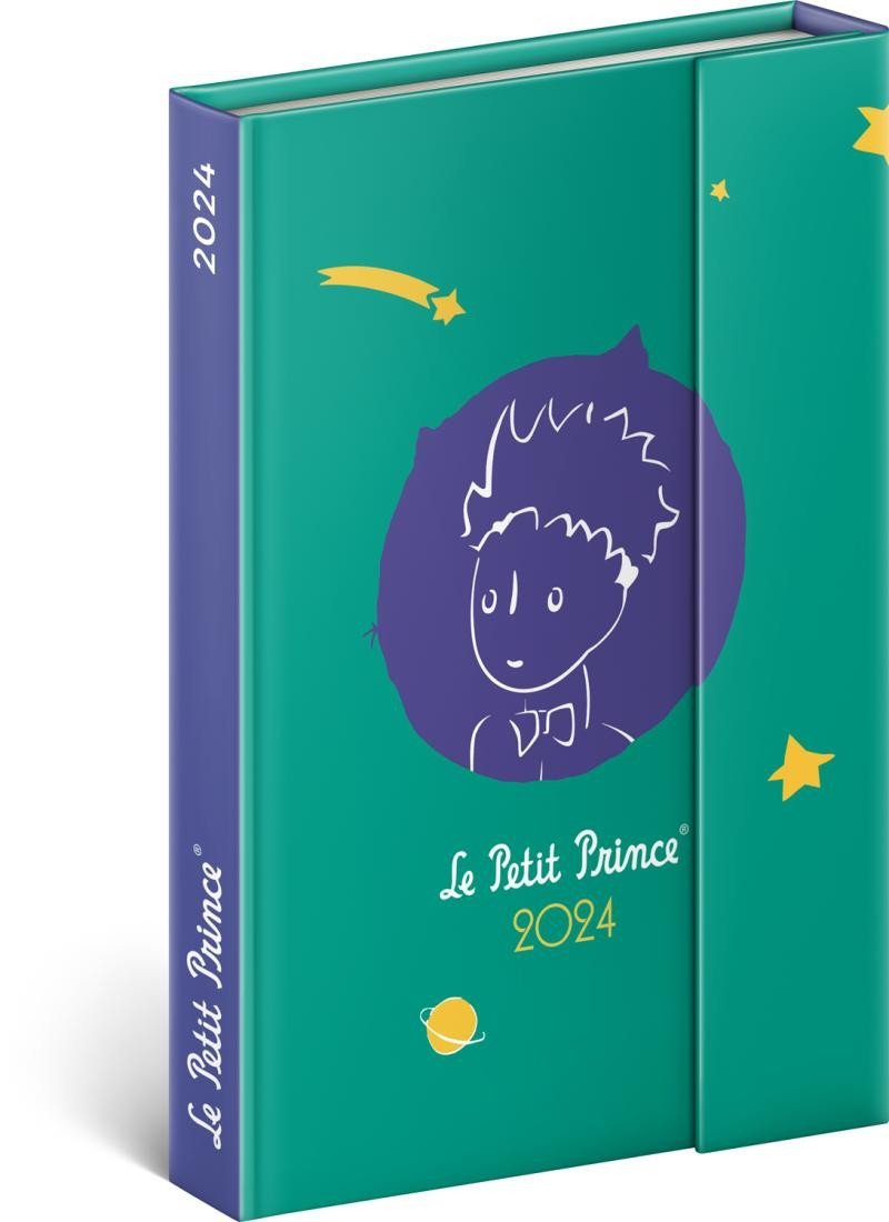 Pětijazyčný týdenní diář s magnetickým uzavíráním obsahuje přehled mezinárodních svátků, seznam českých a slovenských jmen, přehled roku 2024 a 2025, adresář a kapsičku na zadní předsádce. Sloupcové rozvržení s prostorem pro poznámky na každý den. Diář doplňují ilustrace Malého prince.