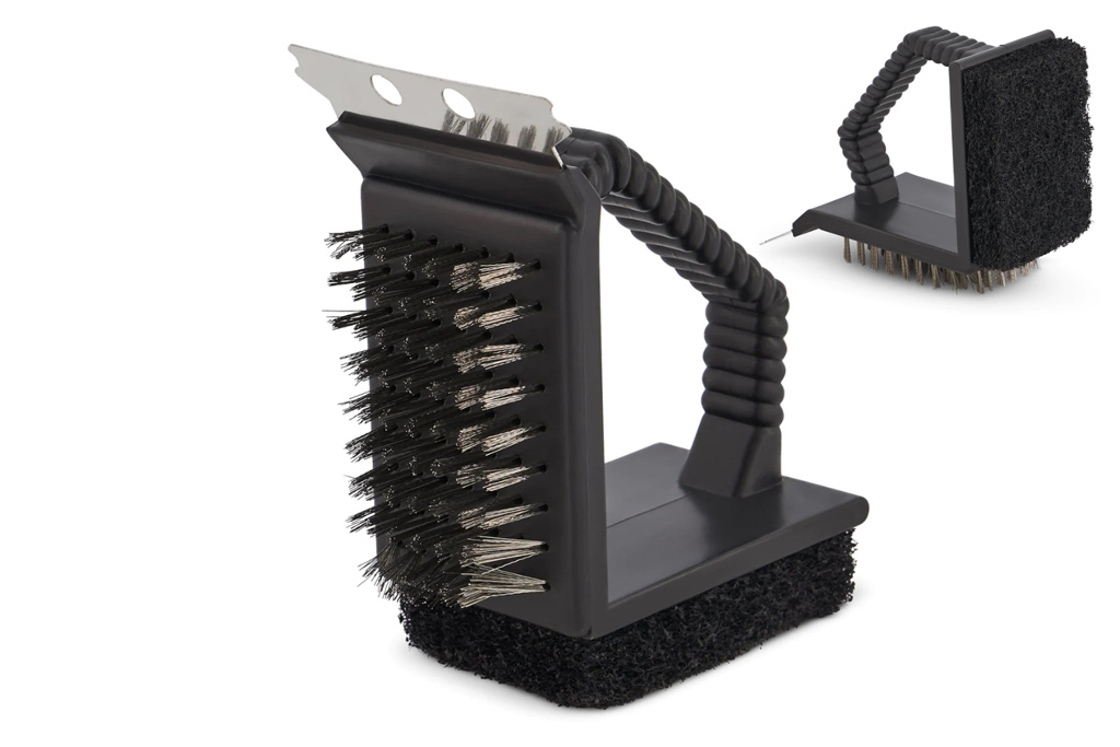 Kartáč čistící na gril 3v1 s mosaznými štětinami, nylonovým polštářkem a kovovou škrabkou