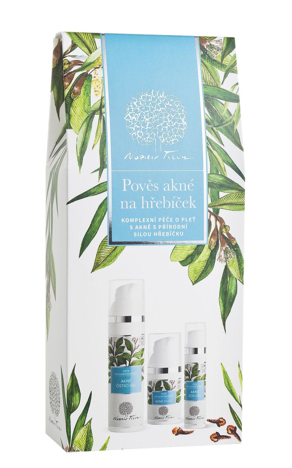 Sadě tří kosmetických produktů pro péči o pleť s akné vládne síla éterického oleje z hřebíčku. Jeho antimikrobiální a čisticí vlastnosti pomohou zmírnit projevy akné, jeho aroma rozptýlí chmury a posílí sebevědomí. Bylinné extrakty z rybízu a maliníku, éterické oleje z grapefruitu a tea tree a další aktivní látky pleť zklidňují, hydratují a působí proti ucpávání pórů.