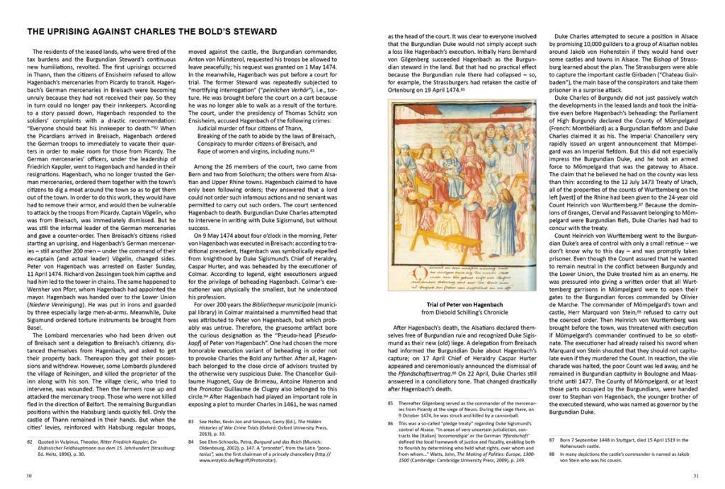 This book presents the European politics leading to the conflicts, then the Duke's campaigns against Liege starting in 1467, his siege of Neuss on the Rhine, the fighting in the Sundgau and Lorraine. It moves on to the battles against the Swiss staring in 1474, and finally addresses the conflict with the Duke of Lorraine in 1477.