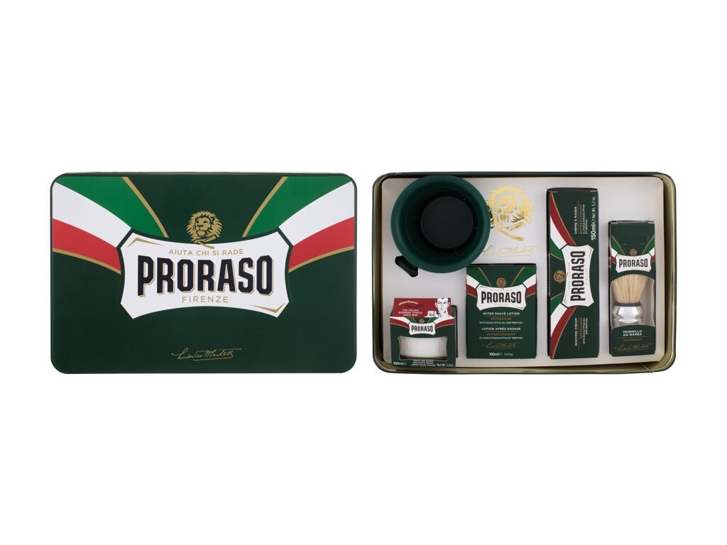 PRORASO Green krém před holením Green 100 ml + krém na holení Green 150 ml + voda po holení Green 100 ml + štětka na holení 1 ks + miska 1 ks + plechová dóza