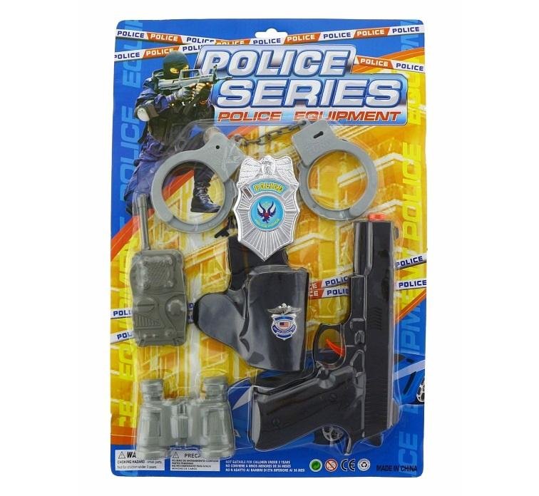 ZESTAW POLICJANTA (5 ELEMENTÓW) W skład zestawu wchodzą: czarny pistolet Policjanta, srebrną imitację lornetki, srebrną odznakę Policyjną, kajdanki, imitację walkie-talkie, pokrowiec Wymiary lornetki: 8 x 6 cm: 27 cm Wymiary odznaki : 10 x 6,5 cm Długość pistoletu : 18 cm Kolor: czarny, szary, czerwony Materiał: plastik
