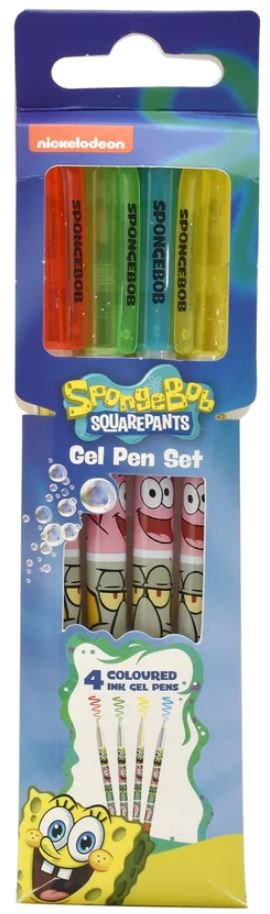 Balení 4 gelových per s potištěnou grafikou hlavních postav z animovaného seriálu Spongebob v kalhotách.