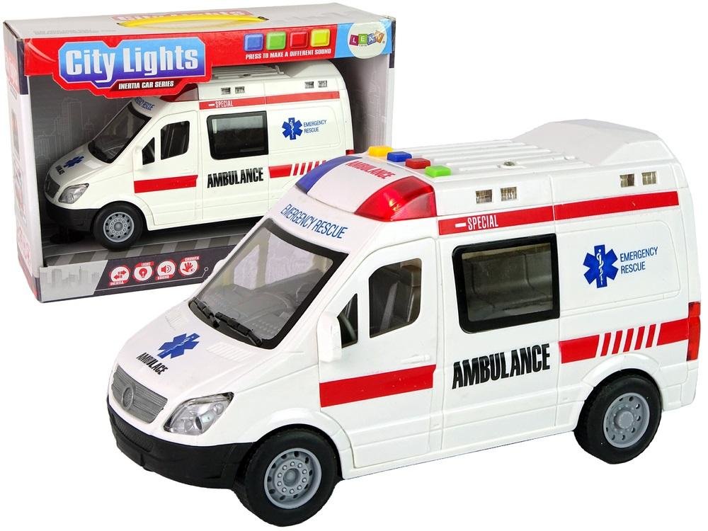 Karetka Pogotowia Światła Dźwięki Napęd Frykcyjny Urocza biała karetka z napędem frykcyjnym to fascynująca zabawka - działa na baterie i posiada 4 kolorowe przyciski, każdy uruchamiający inny dźwięk. Dzieci będą zachwycone możliwością otwierania drzwi i oglądania wnętrza pojazdu, a także...