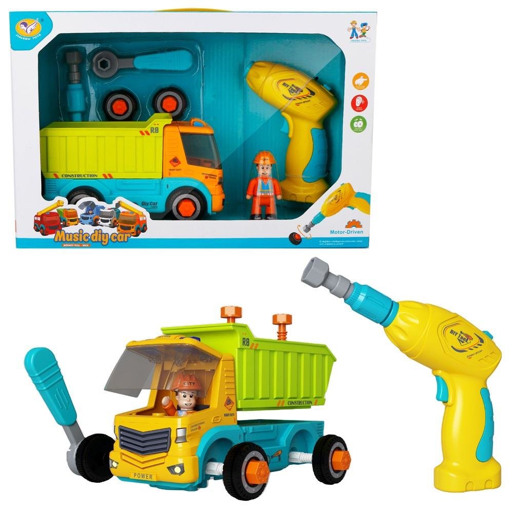 Wywrotka do skręcania z wiertarką. W zestawie również klucz do montowania kół oraz kierowca. Przednia szyba auta podnoszona, dzięki czemu można wyjąć kierowcę. Samochód z dźwiękami, wymaga baterii - 2xAAA (niedołączone). Wiertarka wymaga baterii - 2xAA (niedołączone). prečítať celé