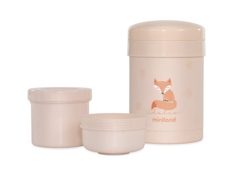 Vakuová termoska Miniland je vyrobena z vysoce kvalitní dvoustěnné oceli a díky tomu udrží několik hodin požadovanou teplotu dětského příkrmu.