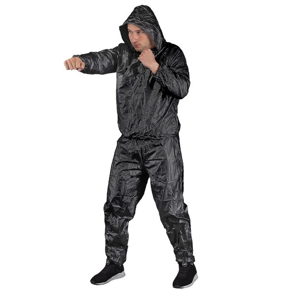 Saunový oblek tvorí nepropustná kombinácia nohavíc a trička s dlhým rukávom a kapucňou, ktorá zvyšuje povrchovú teplotu tela pri fyzickej aktivite. Vďaka tomu telo spáli viac energie a odplaví nadbytočnú vodu, čo môže viesť k rýchlemu zníženiu hmotnosti o 2 až 3 kilogramy. Oblek je vyrobený z kvalitného materiálu PVC s hrúbkou 12 mm, ktorý je ľahký (len 400 g) a zároveň odolný.