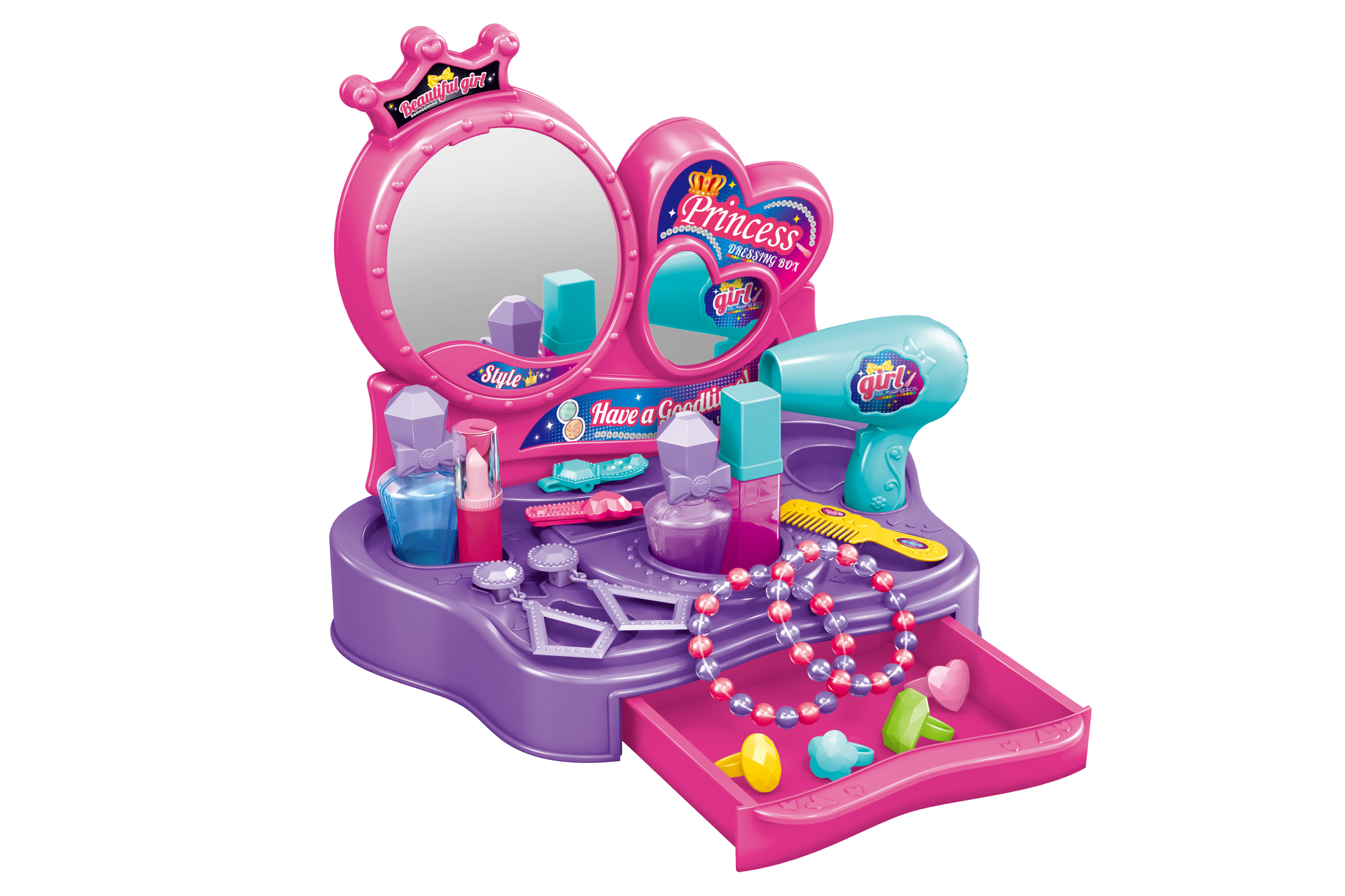 Kosmetický stolek s doplňky set. Rozměry 25x23x22 cm. Balení obsahuje: stolek se zrcátkem, fén, prsteny, náramky, sponky do vlasů, lahvičku od parfému, rtěnku. prečítať celé