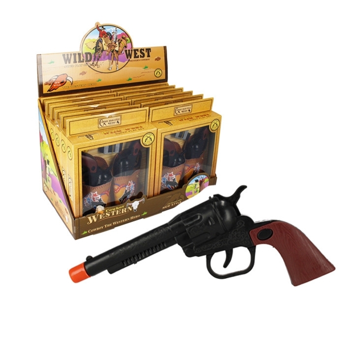 Pistole kovboj, má zvukový efekt, který zazní po stisku spouště. Obsah sady je 2x pistole. rozměry produktu jsou 20x9x4cm. Baleno po 12 kusech. Cena za 1 sadu. Výrobek je určen pro děti ve věku 3+. prečítať celé