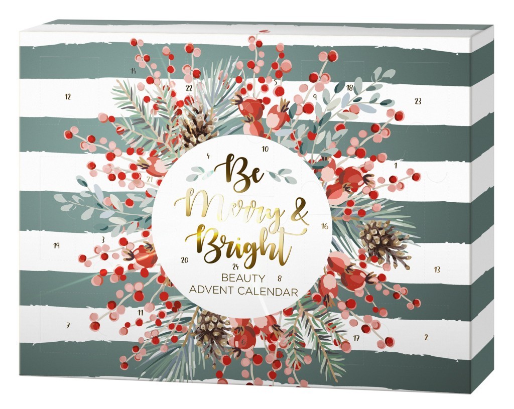 „Adventní kalendář Be Merry & Bright – nechte se v každém z 24 adventních dnů překvapit skvělými kosmetickými produkty a praktickými malými pomocníky. Barevně sladěná kosmetika – od očních stínů a laků na nehty až po lesk na rty a rtěnku – vytváří dokonalý vánoční vzhled. Klasický vánoční design...