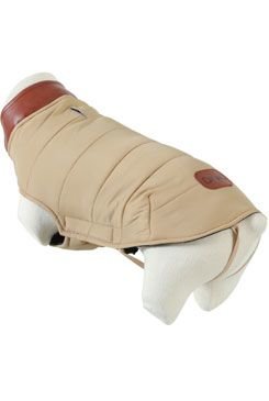 Nepromokavá prošívaná trendy bunda je velmi pohodlná. V oblasti krku a hrudníku je nastavitelné pružné zapínání na suchý zip. Límec a nášivka na zádech s nápisem DOG ze syntetické hnědé kůže. Obleček má intergrované otvory na vodítko a na nohy.