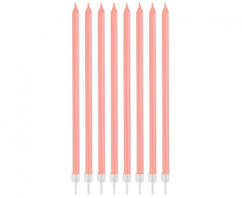 Tento balík obsahuje 8 kusov sviečok v jemnej ružovej farbe, ktoré svojim vzhľadom oživia každú narodeninovú alebo slávnostnú tortu. Dĺžka sviečok 15,5 cm je perfektná pre výraznú dekoráciu bez rizika rýchleho dohorenia. Držiaky navyše zabezpečia, že sviečky zostanú pevne na svojom mieste počas celej oslavy.