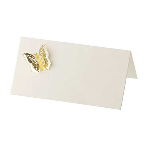 Jmenovky Zlatý motýl - 10ks. Ohromující označení míst s laserem vyřezaným zlatým motýlem. Jmenovky, vyrobené ze slonovinového kartonu, odkáží vaše hosty k jejich sedadlům. Mohou být použity samostatně nebo jako doplněk s jinými dekoracemi s motivem motýlů. Krásný způsob, jak začlenit tento oblíbený motiv do vaší svatební výzdoby.