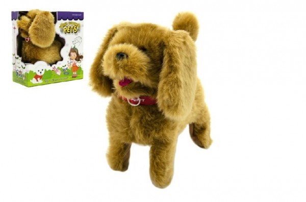 Pejsek chodící na ovládání tlesknutím plyš 20cm na baterie se zvukem v krabici 23x24x11cm