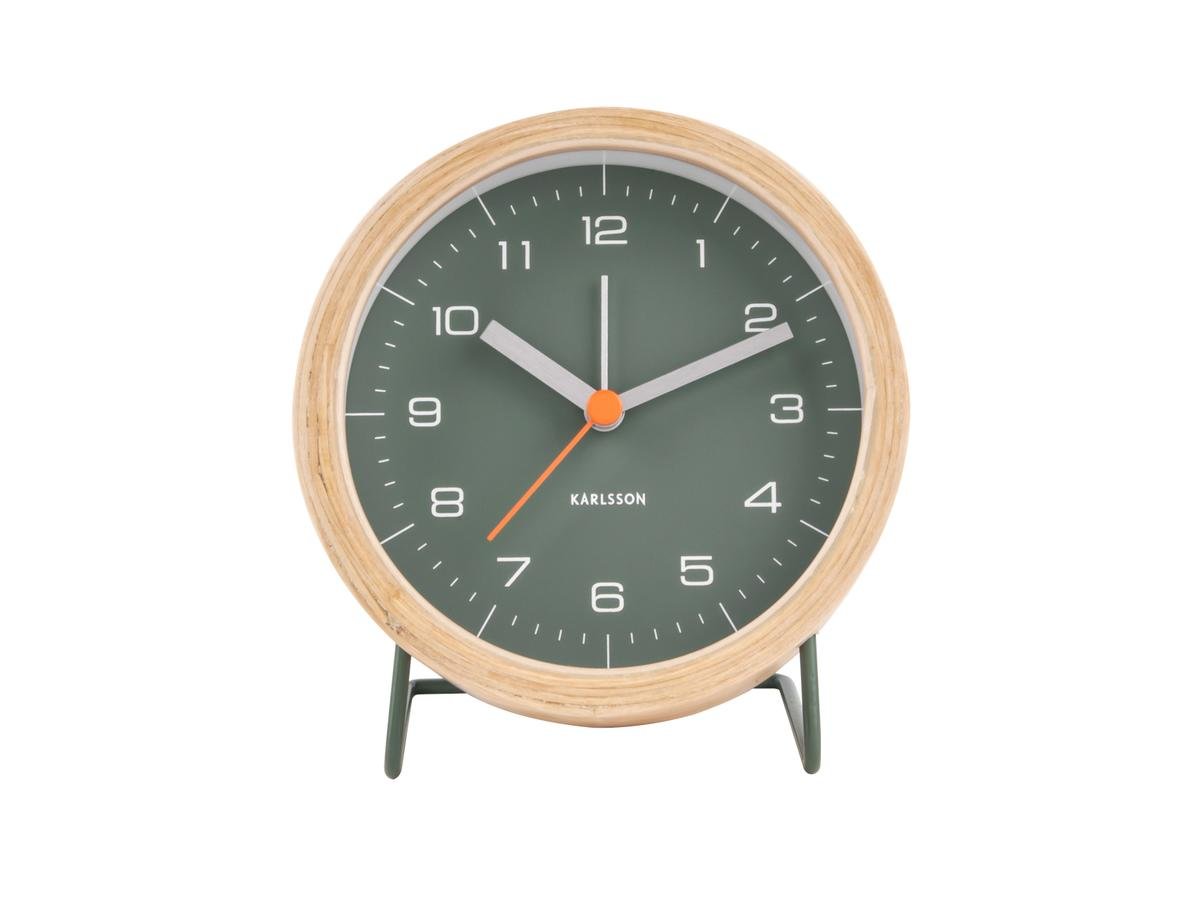 Retro budík Innate se zeleným ciferníkem v dřevěném provedení.