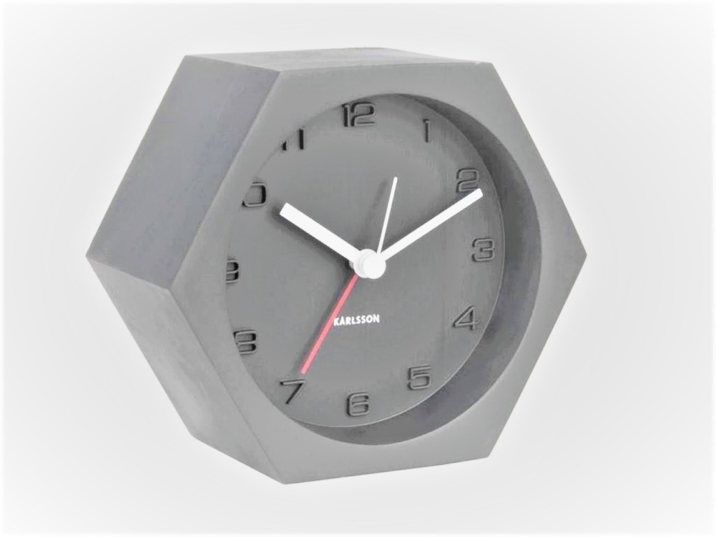 Budík v béžové barvě ve tvaru šestiúhelníku.