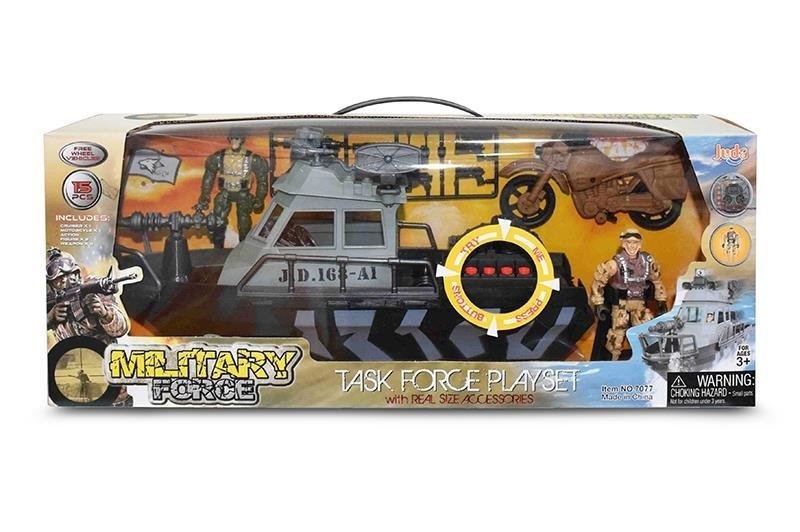 W zestawie: łódź wojskowa na kółkach 34 cm., 2 figurki żołniery, motocykl, flaga, akcesoria wojskowe, funkcje: przyciski uruchamiają komendy żołnierza oraz odgłosy strzałów i wybuchów, ruchome elementy, wym. Opk.: 43,5 x 17 x 11 cm., Baterie: 2 x ag13 (lr44 1,5v) - brak w zestawie, wiek: 3+