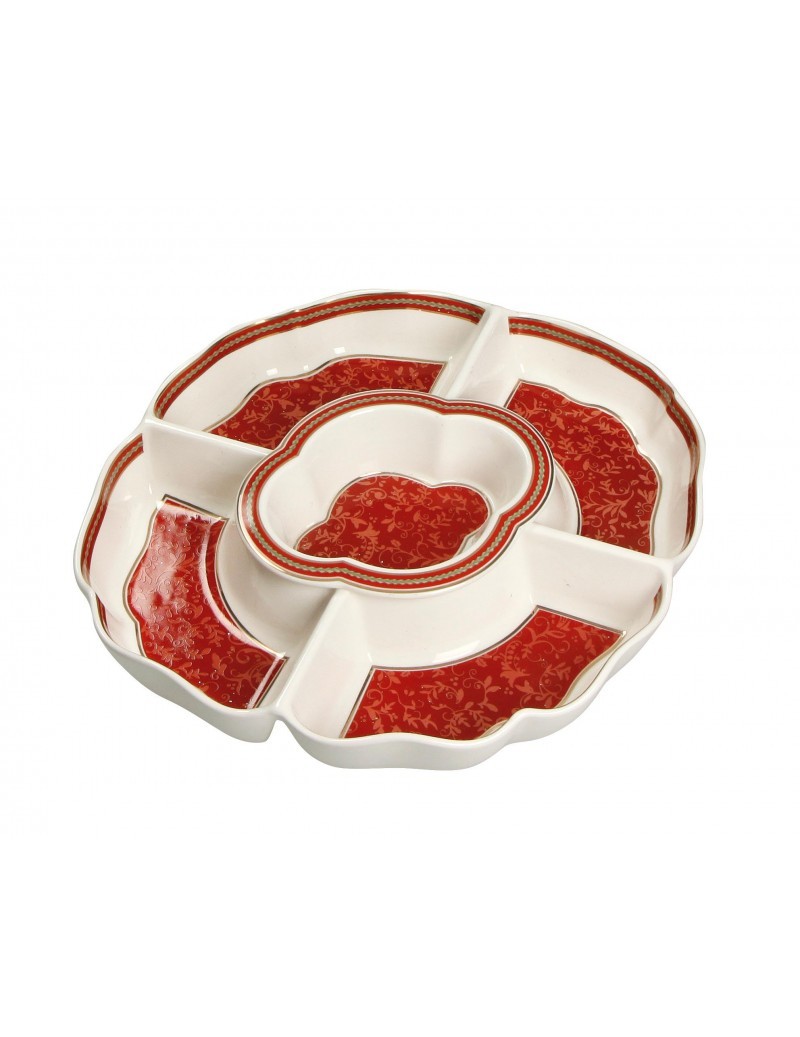 Tác dělený na 5 částí z porcelánu v červené/bílé barvě s vánočním motivem.