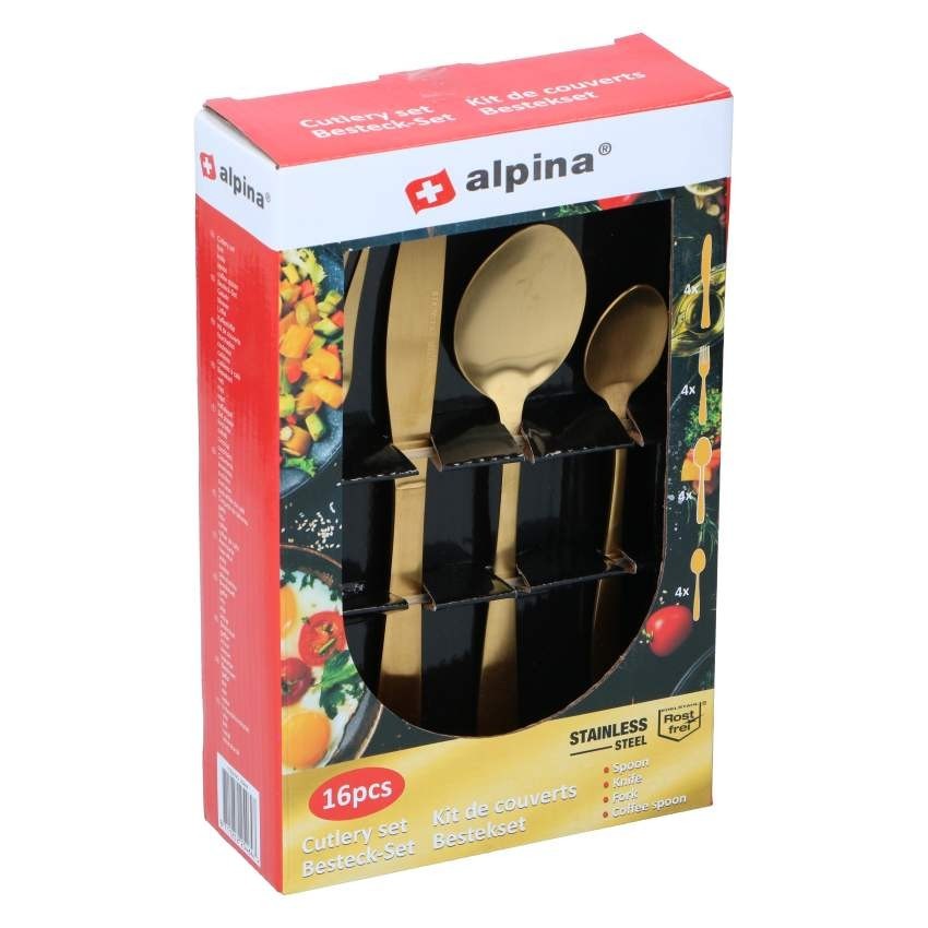 Táto 16-dielna sada od značky Alpina je vyrobená z kvalitnej nerezovej ocele s matným zlatým povrchom, ktorý vyniká vysokou odolnosťou a dlhou životnosťou. Sada obsahuje všetko potrebné pre pohodlné stolovanie štyroch osôb: štyri stolové vidličky (20 cm), štyri polievkové lyžice (19,5 cm), štyri stolové nože (22 cm) a štyri čajové lyžičky (14,3 cm).
