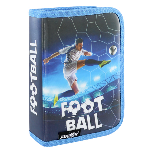 31-dílný plátěný penál s dvojitou klopou a uzavíráním na zip. Obsahuje 10-barevnou sadu popisovačů, 1 kuličkové pero, 2 tužky, 12-barevnou sadu pastelek, malý trojúhelník, rovné pravítko délky 17 cm, gumu, ořezávátko, v jedné klopě je umístěn rozvrh hodin a v druhé malá násobilka. Materiál polyester.