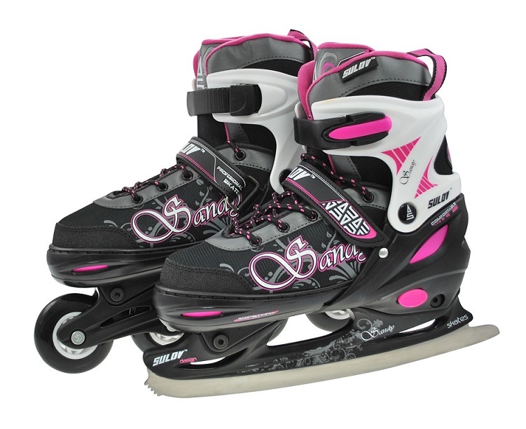 Dívčí nastavitelné brusle s vyměnitelným podvozkem na lední nebo in-line bruslení. Rychleschnoucí prodyšná výstelka pro pohodlné nošení. Brusli lze jednoduše nastavit dle potřeby na 4 velikosti pouhým stisknutím tlačítka na boku v patě brusle.