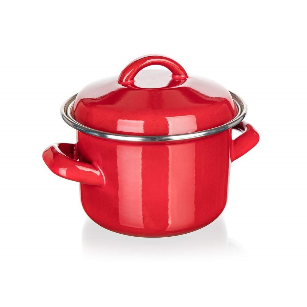 Smaltovaný hrnec MILTON 0.78 litru, rozměry: průměr 12 cm, výška (bez poklice) 8 cm, síla stěny 0.7 mm, poklice i hrnec s červenou smaltovanou glazurou, černým dnem na vnější straně, s krémovou barvou na vnitřní straně.