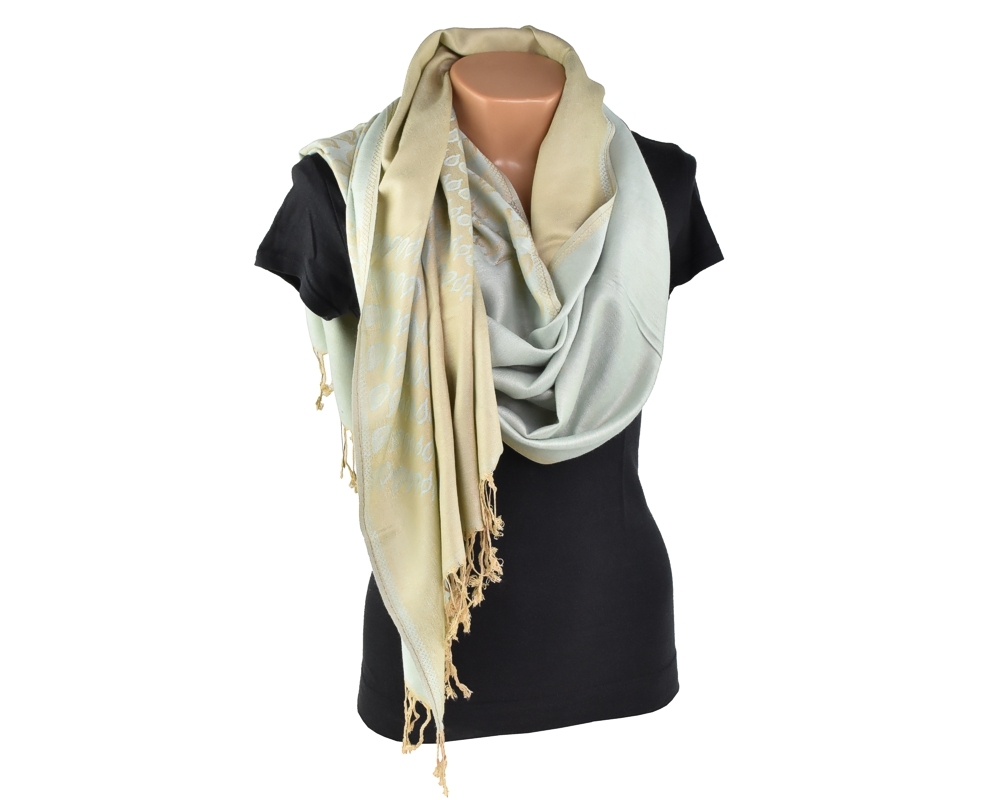 Elegantní šál v imitaci pašminy Popis: vytkaný vzor, třásně na kratších stranách šátku, metalické odstíny Rozměry: 70 x 190cm Materiál: 70% polyester, 30 % bavlnaPozn.Některé kusy mají od výrobce chybně označeno složení. Správné složení šátku je polyester a bavlna. Omlouváme se a děkujeme za pochopení.