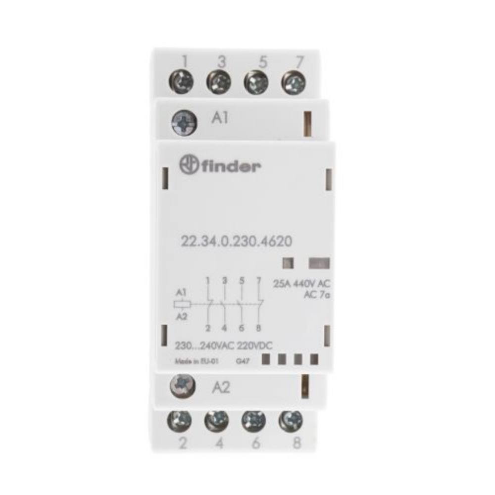 Modulový stykač na DIN lištu, 230V AC, 4-pólový, 2-spínací, 2-rozpínacíModulový stykač je určen pro spínání elektrických obvodů, zejména odporových zátěží,třífázových asynchronních motorů atd.Technické parametry:Jmenovité napětí cívky 230 ACKonfigurace kontaktů: 2-spínací,2-rozpínací; 2PST NO +...