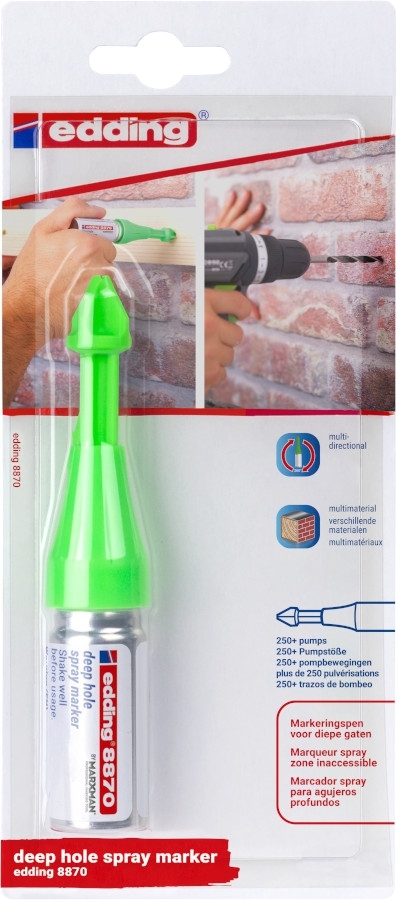 Tento tekutý kriedový sprej je navrhnutý pre netrvalé značenie na takmer všetky typy materiálov. Jeho unikátna tryska umožňuje aplikáciu farby do otvorov do hĺbky až 50 mm a priemeru 3-13 mm, čo je ideálne pri práci v priemysle, stavebníctve alebo pri označovaní skladového tovaru. Sprej je možné použiť z akéhokoľvek uhla vrátane aplikácie nad hlavou, čo výrazne uľahčuje prácu v náročných podmienkach.