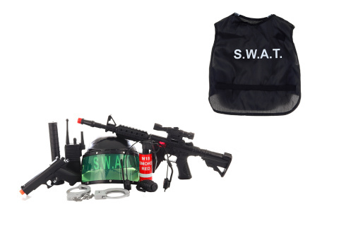 Policejní sada obsahuje helmu, vestu, samopal, vysílačku, pistoli, obušek, pouta, sluchátka a granát. Materiál plast. Baleno v plastovém průhledném obalu. Rozměry balení cca 52x34x12 cm. Velikost vesty 34x37 cm. Věk 3+ prečítať celé