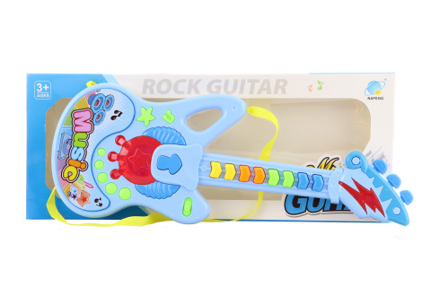 Plastová kytara. Po zmáčknutí tlačítek svítí a vydává zvuky. Napájení na 1,5 AA baterie. Rozměry kytary cca 35 x 12,5 x 2,5cm. Rozměry balení cca 15 x 37,5 x 3,5 cm. Věk 3+ prečítať celé