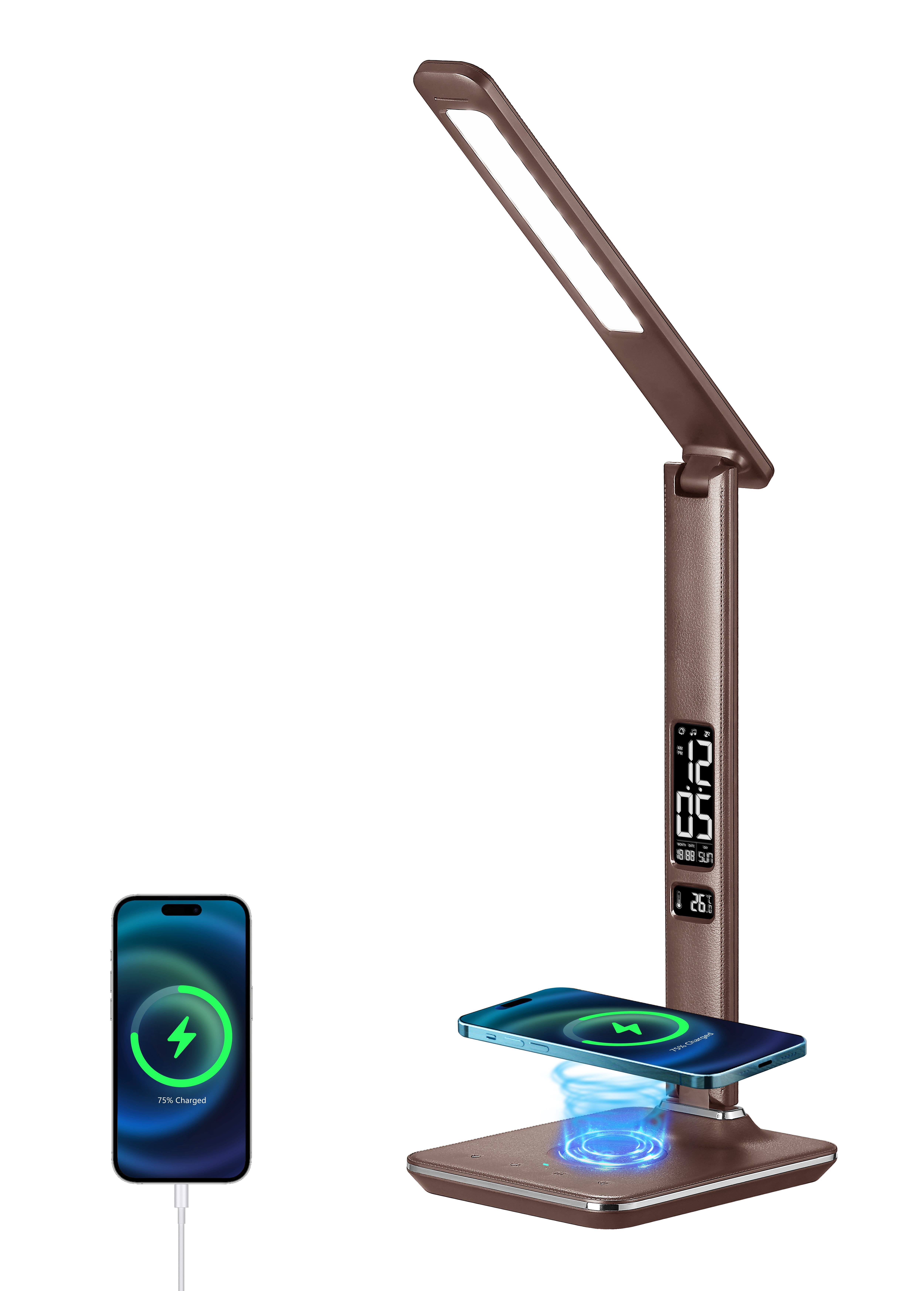 LED stolní lampička Immax KINGFISHER Qi hnědá s bezdrátovým nabíjením Qi a USB