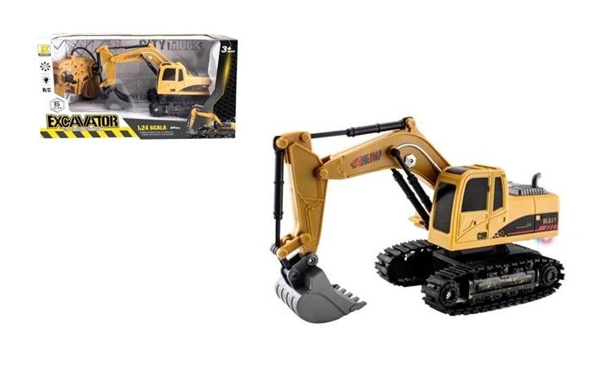 Plastikowa koparka. Zabawka wydaje dźwięki: odpalania maszyny, cofania oraz pracy na budowie przy tym także świeci kolorowymi światełkami. Zabawka działa na baterie AG13. Baterie znajdują się w zabawce. Produkt zapakowany w kartonowe opakowanie z okienkiem. Podane wymiary są wymiarami opakowania. Zabawka dla dzieci od 3 lat.