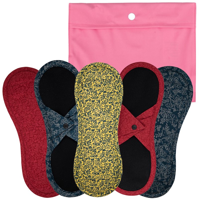 Bamboolik Výhodné sady | Denní vložky látkové | satén & biobavlna Barva: 5 ks: 2x tmavě modrá, 2x červená, 1x žlutá + Pytlík XS Růžový, Varianta: Sada 5 ks - Na patentek + Pytlík XS Růžový